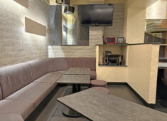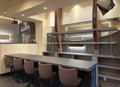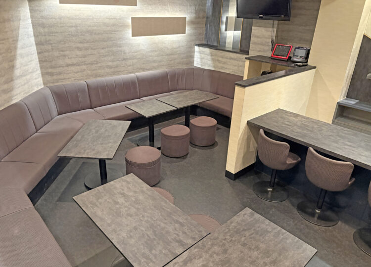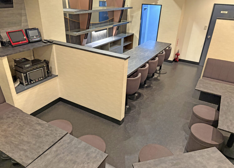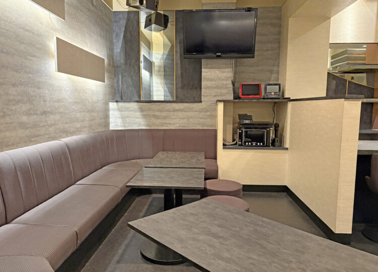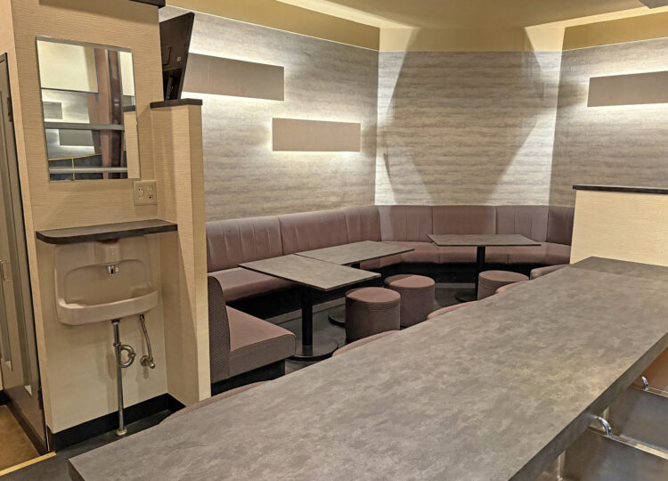 モノトーン基調の内装と壁面の間接照明が特徴的な物件です。団体様にも対応可能な広めのBOX席と、ゆとりのあるカウンターはBARやスナックに向いています。